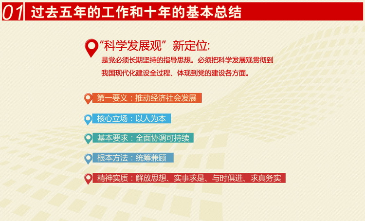 关键词:“科学发展观”。十八大报告对“科学发展观”有了新定位。把科学发展观作为全党全社会必须长期坚持的指导思想提了出来。