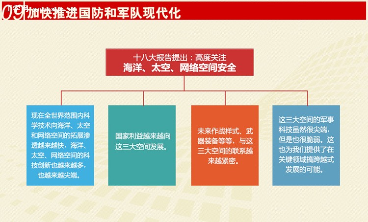 关键词:高度关注“三个空间”安全。党的十八大报告强调要高度关注海洋、太空、网络空间安全,这对我们加强军事战略指导、维护国家安全提出了新的要求。海洋是国际交往的大通道和人类可持续发展的战略资源宝库,当今世界正在兴起新一轮海洋开发浪潮;太空是国际战略竞争新的制高点,太空军事优势对现代战争进程和结局具有决定性影响;网络空间是信息时代的基本标志,正在成为影响国家安全和发展的新兴战略领域,成为渗透、影响甚至决定其他作战空间的重要作战空间。我们要充分认清海洋、太空、网络空间安全形势,加强海洋、太空、网络空间安全问题研究,抓好相关力量和手段建设,为维护国家利益提供有力的战略支撑。