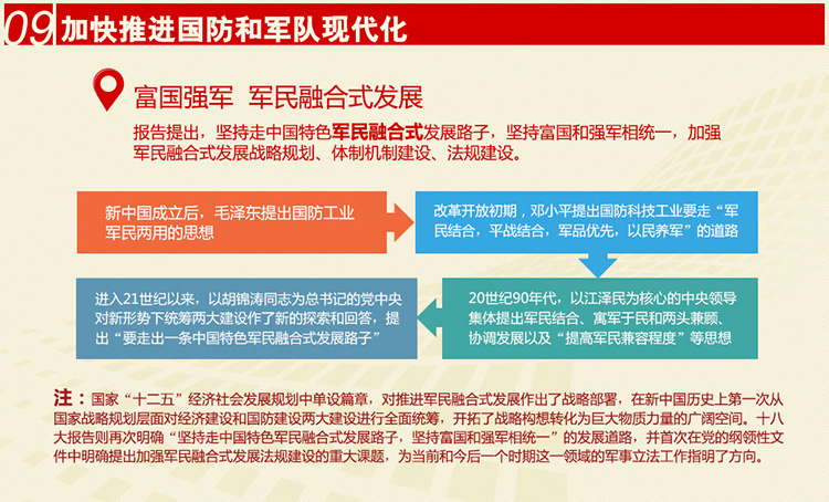 关键词:“富国强军 军民融合式发展”。十八大报告提出“走中国特色军民融合式发展路子,坚持富国和强军相统一”, 明确了建设巩固国防和强大军队是我国现代化建设的战略任务。同时也进一步明确了国防和军队建设在中国特色社会主义事业总体布局中的地位,指引国防和军队建设步入着力提升国家战略能力、与国家经济社会建设同步发展的轨道。