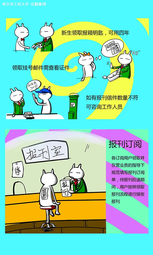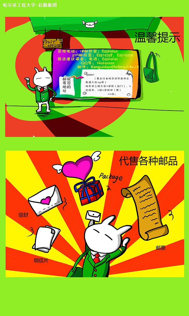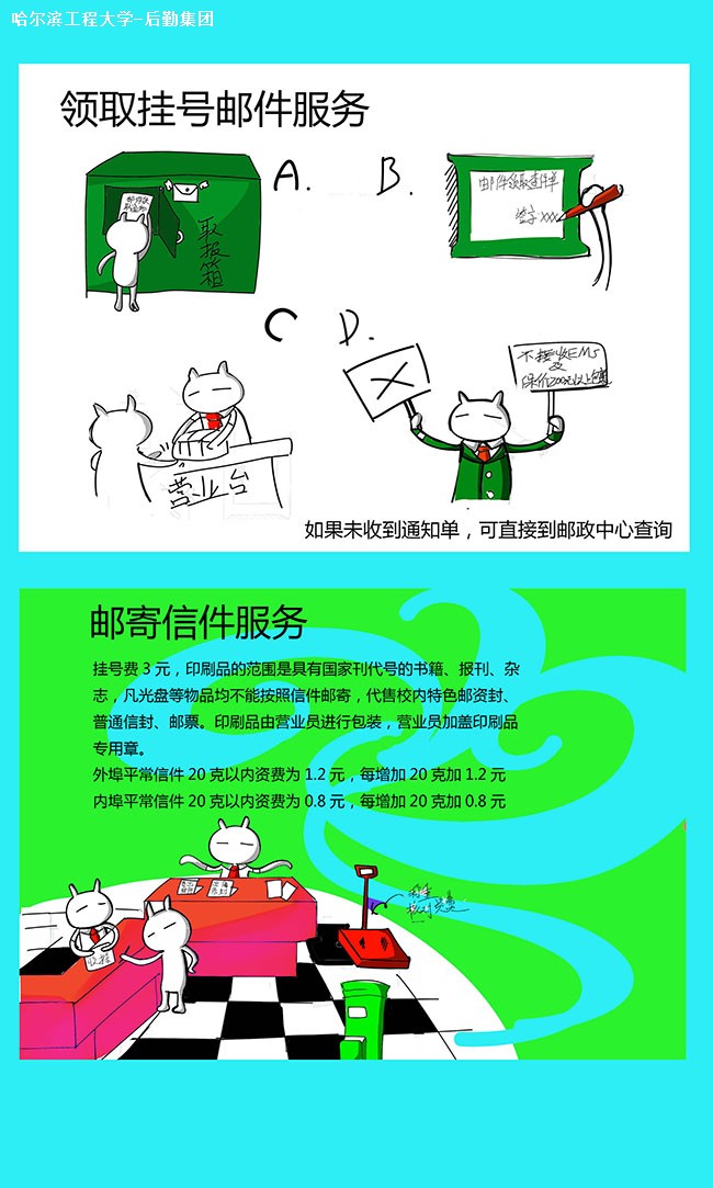此次活动,我校邮政中心将现有服务项目以漫画展板的形式直观的呈现给大家,讲解员详细介绍了我校现有的邮政服务项目、邮寄通讯地址的规范写法及一些校园邮政服务小常识。讲解员带领大家参观集邮展板,从专业的角度介绍了邮票、实寄封、明信片为主要内容的集邮文化,题材包括雷锋精神、十大元帅、哈尔滨风光、冰雪等内容。邮政日当天发行的邮票,有部分被集邮爱好者收藏。活动现场10名幸运同学还获得了当场免费制作的个性化明信片。我校2014年度报刊订阅工作也于当日启动。