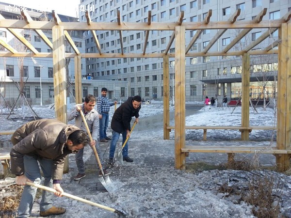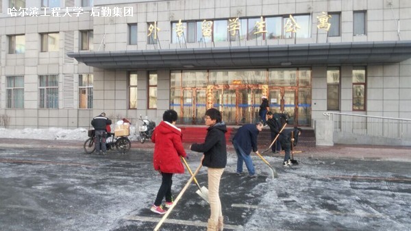 清除路面积冰是公寓对学生的关心爱护;与公寓员工并肩劳动,体现的是同学们对公寓的感谢与感恩。正是这种互通的情感,将公寓员工与住宿学生的心凝聚在一起,使外专留学生公寓成为一个温暖的家庭。