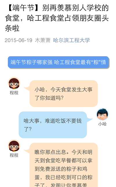 这两天,“别再羡慕别人学校的食堂,哈工程食堂占领朋友圈头条啦”的信息在我校师生的朋友圈中被转发,大家纷纷为食堂员工手工包制粽子的诚意和祝福点赞,很多人的微信朋友圈都被这条微信刷屏了。