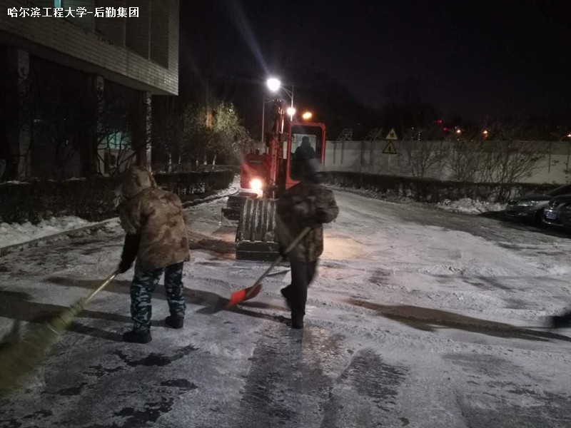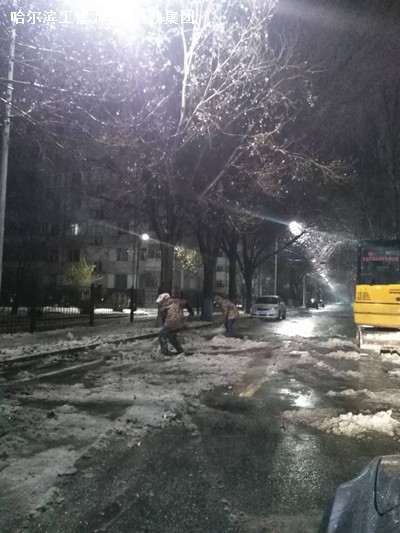 2016年11月10日哈尔滨今冬首场大雪拉开序幕,由于本轮降雪时间长,气温变化幅度较大,前期降雪、中期雨夹雪,致使路面呈湿滑状态,为学校清冰雪工作带来极大挑战。后勤集团绿化中心承担着校园主干道的清雪任务,雪情即是命令,绿化中心员工分秒必争,全员奋战在清冰雪一线。在前期完成校园主干道清雪任务的基础上,为了让全校师生有一个安全的出行环境,绿化中心主动承担起学生分担区内人员密集出行区域的清雪任务。11月13日,后勤集团出动了16台挖掘机,3台装卸机,50余人连续奋战20余小时,即使14日凌晨出现降雨,气温非常低,员工们依然顶着风雪雨水,清雪工作一刻也未停歇。直到14日凌晨6点,员工们才稍事休息,但上午又马不停蹄的投入到新一轮的清雪工作中去。