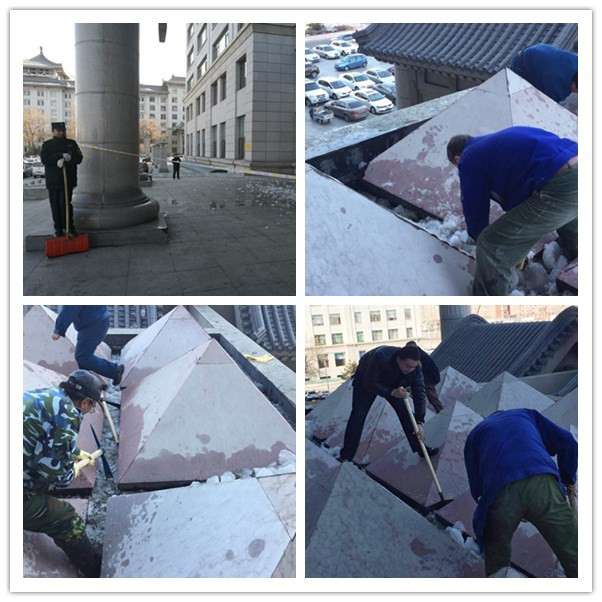 主楼正门区域每到开化下雨时节,均会形成“水帘洞”的情况,门斗上的多个四角锥形结构致使冰雪停留在夹缝中,冰雪融化后会在缝隙滴入到主楼正门前,给师生通行带来不便,为排除隐患,3月21日下午维修组全部员工来到门斗上,由于结构特殊,清理人员站都站不稳,用铲子和镐进行刨、震、翘把夹缝中的冰块清理干净,员工在工作中干的满头大汗,但是维修组成员说解决了难题,完成了任务,为师生提供方便,他们心里就是高兴的。