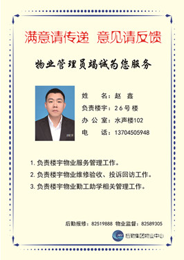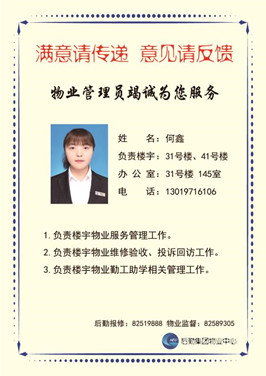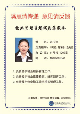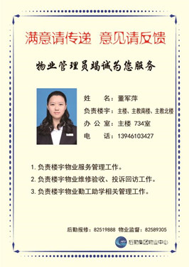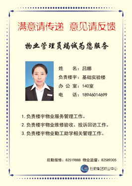“满意请传递意见请反馈”,物业中心教学楼管理员竭诚为您服务,这是物业人的心声。此次宣传板的展示,拉近物业人与师生间的距离,让物业人更好的去服务于师生,为师生办好事。