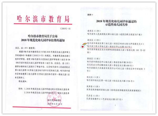 2018年9月,幼儿园根据《哈尔滨市示范性幼儿园评审标准(试行)》和《哈尔滨市规范化幼儿园评审标准(试行)》要求,通过自查创建,市区教育部门评估小组交流访谈、查阅资料、实地查看等方式对我园园务管理、办园条件、保育教育、卫生保健、安全工作、教师专业技能等方面做了大量晋级评估验收的准备工作,今年8月23日顺利晋级为哈尔滨市市级示范幼儿园。