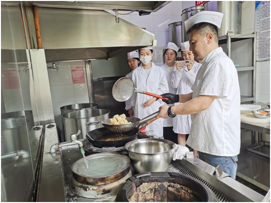 为深入贯彻学习习近平新时代中国特色社会主义思想主题教育,进一步深化“五个行动方案”,提升服务育人和实践育人工作,后勤集团产业党支部成功举办了第二期美食小课堂活动,于6月15日在国际交流中心开展。此次活动旨在为学生提供劳动实践机会,将劳动教育融入学生日常生活,通过学习菜品制作的过程中感受工匠精神,引导学生崇尚劳动、尊重劳动、乐于劳动。共有10名同学参加了本期美食小课堂活动,并由国际交流中心行政总厨杜广航和面点师张丽担任讲师。