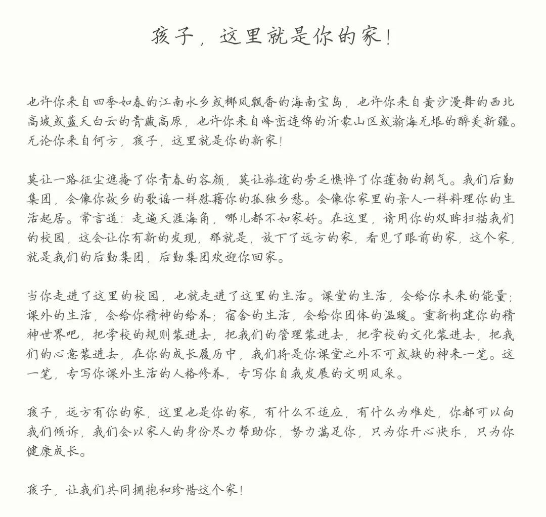 各位新同学:你们四年的吃住行方方面面由我们后勤集团承包啦!